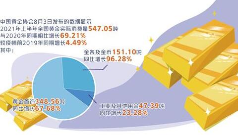 中國黃金協(xié)會8月3日發(fā)布的數(shù)據(jù)顯示,2021年上半年全國黃金實際消費量547.05噸,與2020年同期相比增長69.21%,較疫情前2019年同期增長4.49%。其…